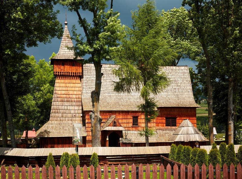 Kościół ten to najcenniejszy z zabytków Podhala. Zbudowany ok. 1480, posiada najstarszą na świecie polichromię, pokrywającą całe wnętrze drewnianej konstrukcji świątyni. Polichromia, licząca, tak jak i kościół niemal 540 lat, wykonana jest w 33 kolorach i zawiera 77 powtarzalnych motywów. Bardzo cenny jest obraz w ołtarzu głównym. Przedstawia on „świętą rozmowę” św. Katarzyny i św. Michała Archanioła z Matką Boską (ok. 1500). Obraz ten stanowi przykład przejścia ze średniowiecza do renesansu w malarstwie sakralnym – choć postacie są jeszcze monumentalne (średniowiecze), w tle pojawia się już krajobraz (renesans). Najstarszym obiektem jednak jest krucyfiks w tęczy (XIV w.), zwany „drzewem życia”, gdzie pionowa belkę stanowi pień drzewa, a ramiona – wyrastające gałęzie. Krzyż ten – to pozostałość wcześniej istniejącego tu kościoła. Niżej, na ścianie – kopia najstarszego polskiego obrazu sztalugowego (XIII w.), przedstawiającego święte Katarzynę i Agnieszkę, który znaleziono tu podczas jednego z remontów. Obok – proporzec husarski wojsk Jana III Sobieskiego, które przez Dębno wracały do kraju po wiktorii wiedeńskiej. Wbrew prawom fizyki działają tajemnicze cymbały, służące jako gong mszalny. Cienka sztabka wydaje dźwięki niskie, gruba zaś – wysokie.